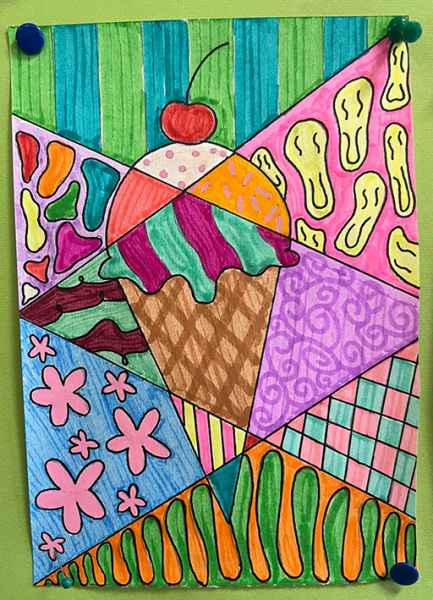 Aber nicht nur der Kubismus hat uns begeistert – wir haben uns auch mit der farbenfrohen und dynamischen Pop-Art beschäftigt! Mit kräftigen Farben, markanten Mustern und spannenden Kontrasten haben wir Eiscreme-Bilder im Pop-Art-Stil gestaltet, die richtig gute Laune machen.