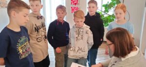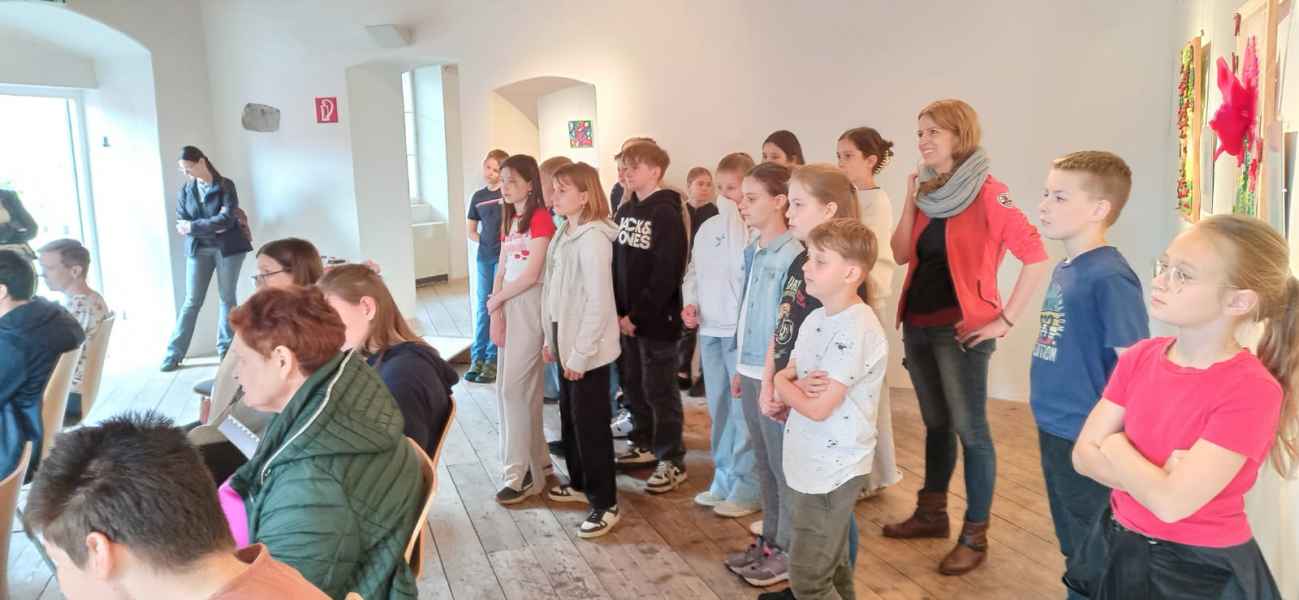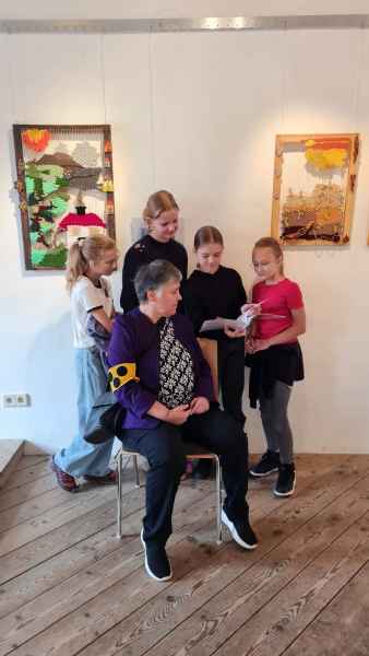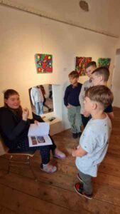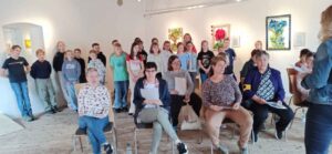 Die Schüler und Schülerinnen wurden freundlich empfangen und waren sehr beeindruckt von den Werken der Künstlerinnen. So fiel es dem ein oder anderen letztendlich sehr schwer zu sagen, welches der Kunstwerke nun am besten gefallen hat. Die Aufmerksamkeit der 1. m Klasse galt auch dem Schaffensprozess und der Herstellung der Bilder. Es wurden eifrig Fragen gestellt und es fanden vor Ort wunderbare Gespräche zwischen den Künstlerinnen und den interessierten Schülern und Schülerinnen statt.