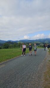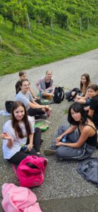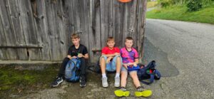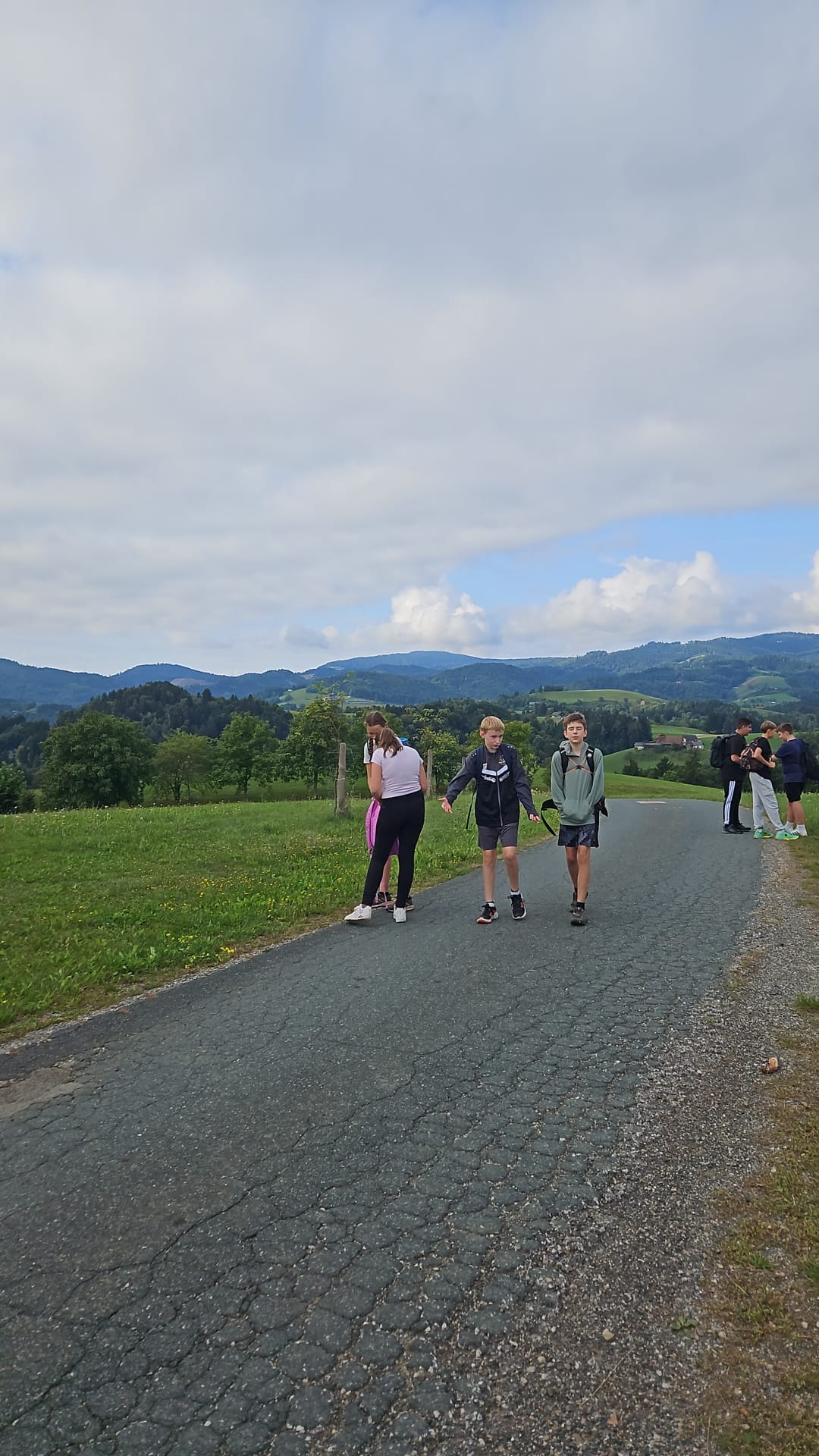 Die Route führte die dritten Klassen zum Buschenschank Garber. Auf dem Weg dorthin wurden einige Pausen eingelegt – Zeit genug, um gemütlich zu jausnen, die Natur zu genießen und von den Ferien zu erzählen. Die Stimmung war super, es wurde viel gelacht und geplaudert.