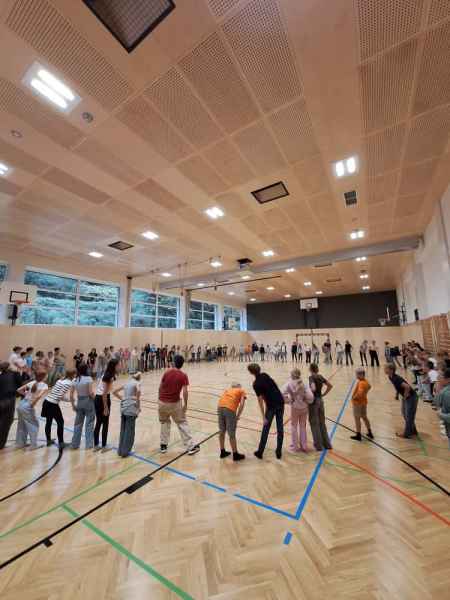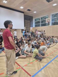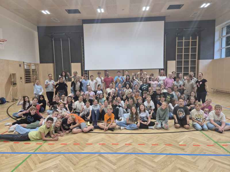 Am ersten Tag arbeitete Chico Santana mit den rund 100 Kindern des Musikschwerpunkts im Turnsaal. Er brachte den Schülern brasilianische Musik von Samba über Ijexá bis Baião näher, wobei sie sich an Bodypercussion und Gesang versuchten.