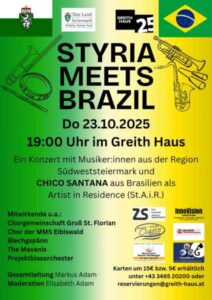 - 23. Oktober: Abschlusskonzert „Styria meets Brazil“ im Greith-Haus in St. Ulrich im Greith. An diesem Abend verbinden steirische und brasilianische Künstler ihre Musik, natürlich wieder mit dabei: die 2m der MMS Eibiswald.