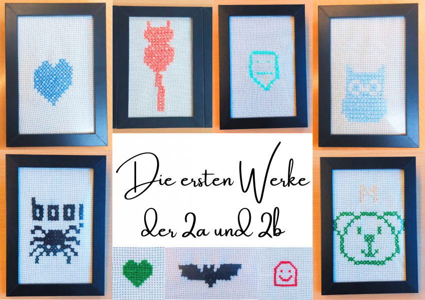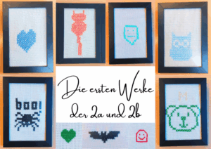 Die 2a- und 2b-Klasse beschäftigten sich mit dem Kreuzstich: Zuerst wurden eigene Motive auf kariertem Papier entworfen, anschließend mit Nadel und Faden liebevoll umgesetzt. Passend zur Jahreszeit entstanden wunderschöne Herbst- und Halloween-Bilder, die nun in stilvollem Rahmen präsentiert werden.
