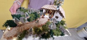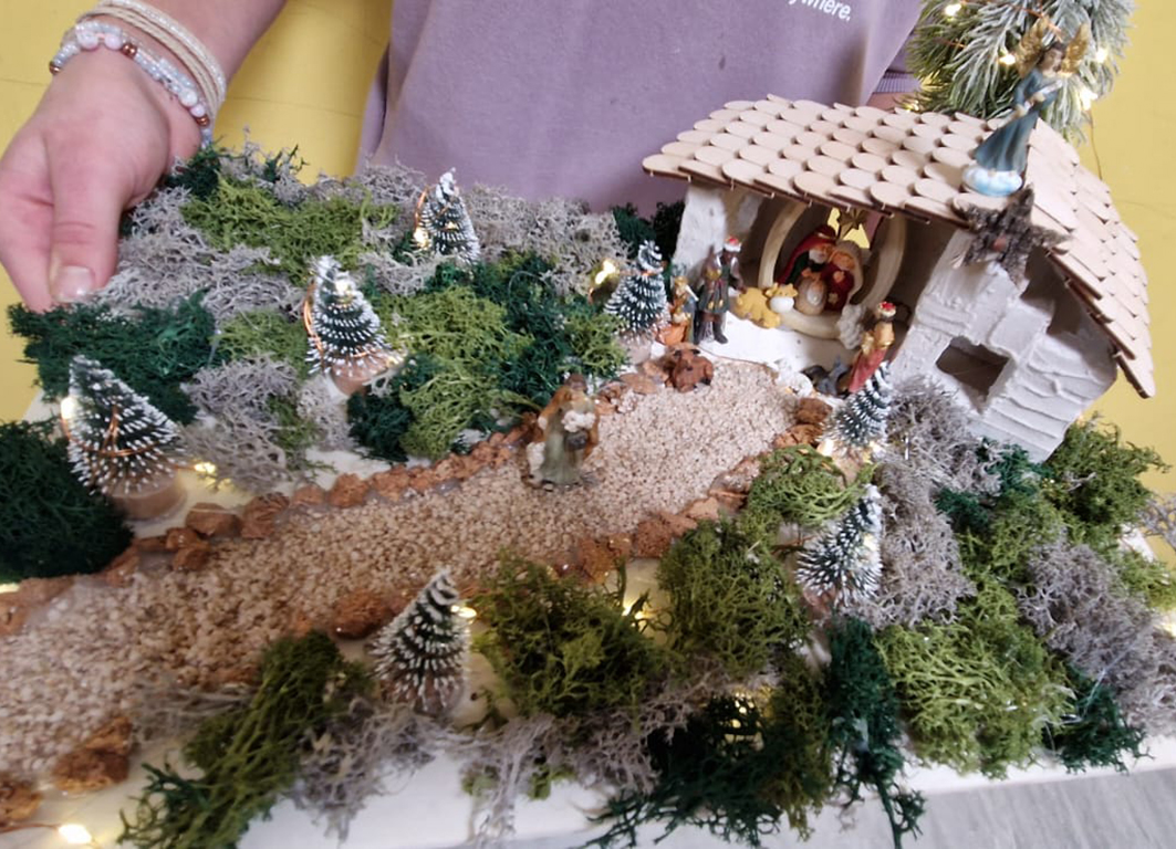 Im nächsten Schritt verwandelten die Schülerinnen und Schüler ihre Krippen in liebevoll gestaltete Weihnachtslandschaften. Mit Naturmaterialien wie Moos, kleinen Ästen, Steinen und Stroh schmückten sie die Szenerie. Passende Krippenfiguren rundeten das Werk ab und ließen die Krippen lebendig wirken.