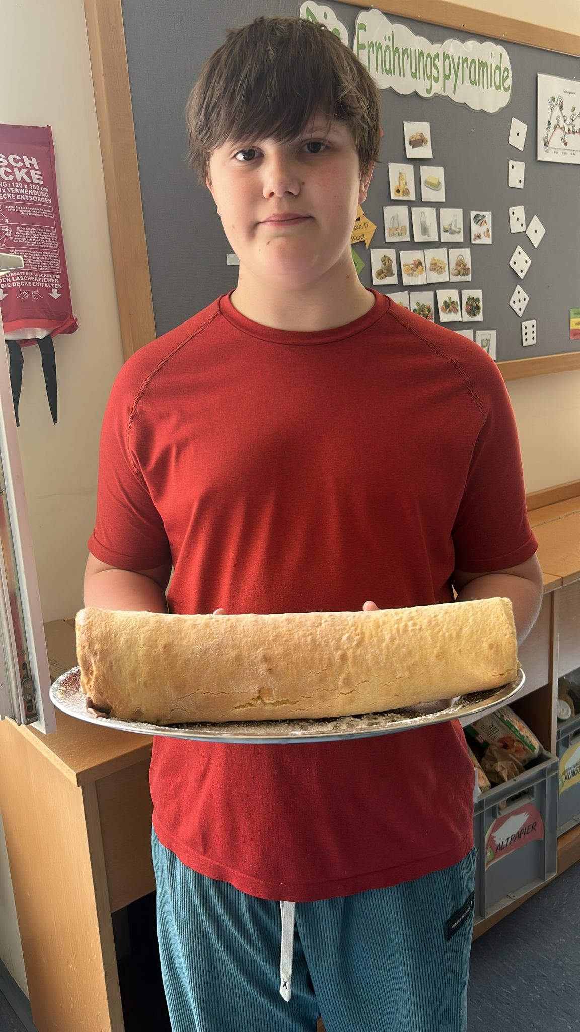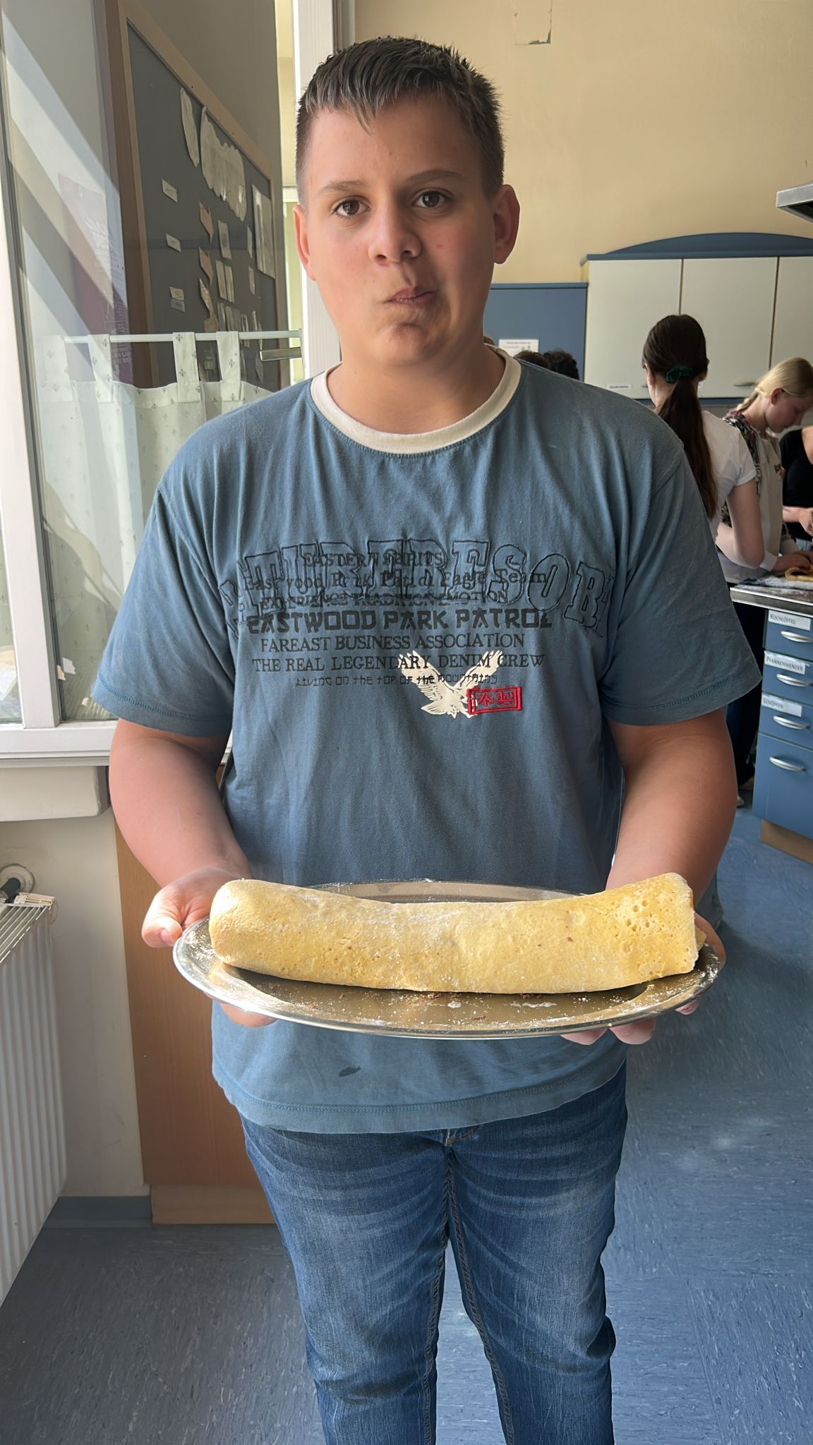 In unserer letzten Einheit drehte sich alles um die Biskuitroulade – und unsere Schülerinnen und Schüler waren mit voller Begeisterung dabei! Jedes Kind stellte seine eigene Roulade her: von der klassischen Variante mit Marmelade oder Nutellacreme, über die Nussroulade, bis hin zur Schokoroulade mit Schlagobers und Himbeeren.